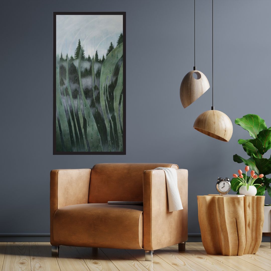 This stunning oil painting captures the serene beauty of Tollymore Forest, a famous woodland in Northern Ireland, viewed through a condensation covered window. The artwork showcases mist rolling through towering evergreen trees, creating an ethereal and calming atmosphere. The soft, muted tones of the forest blend with the misty sky, evoking a sense of tranquillity and wonder. Michelle’s skillful use of oil paints brings the natural beauty of this iconic landscape to life in a modern and abstract way, making it a perfect piece for nature lovers and art enthusiasts alike.
